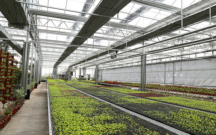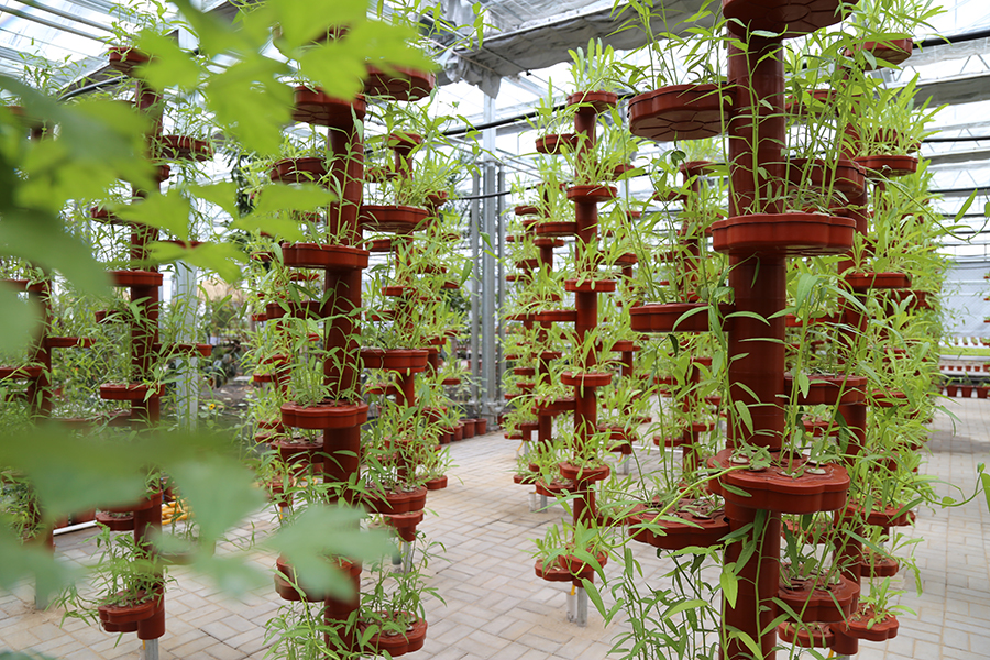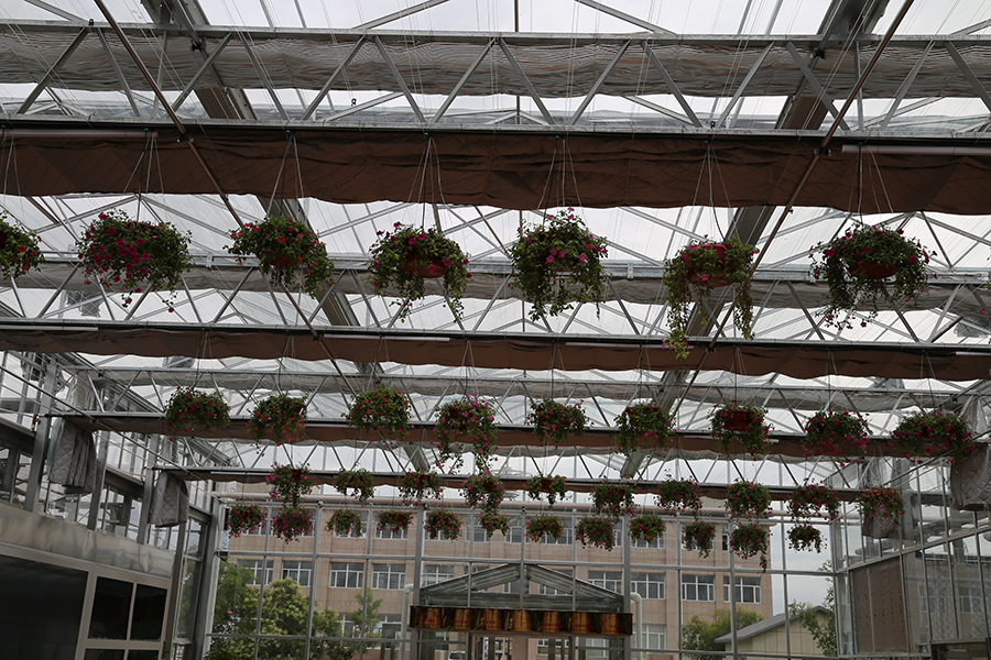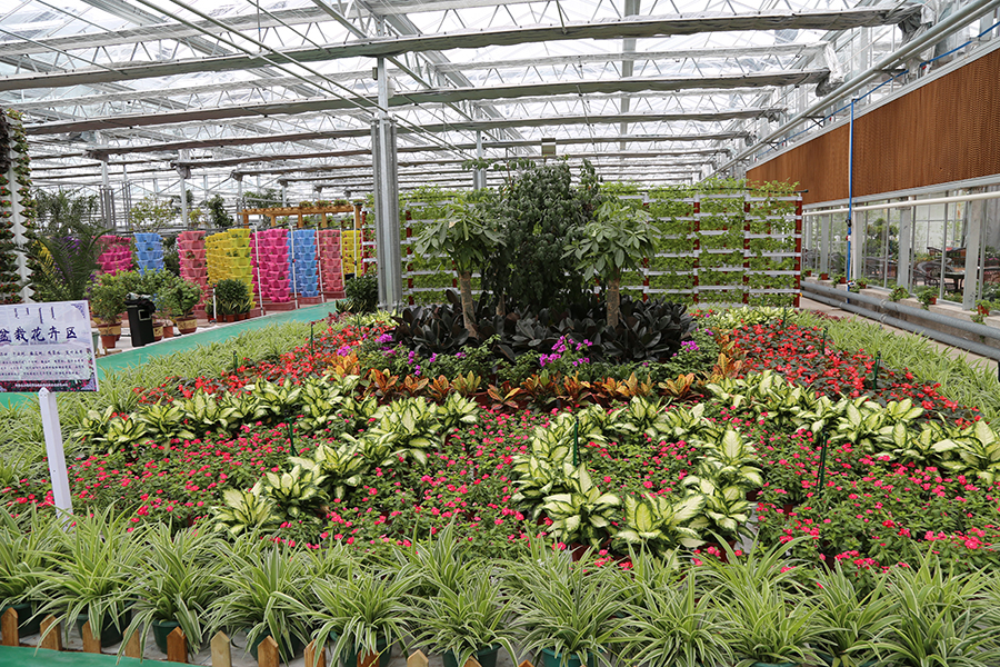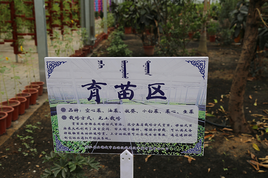 該智能溫室大棚占地約6000平方米,分為一號廳和二號廳。其中一號廳是新建的有錯層的玻璃溫室,分為盆栽花卉、盆栽果樹區、沙生植物區、熱帶風情區、家庭園藝區等功能區。二號廳由舊溫室改造而成,頂部為陽光板,四周立面為玻璃,配置了智能控制系統,有無土栽培區、育苗區、采栽體驗區等功能區。智能溫室全部配備了內、外保溫系統,冬季保溫,比普通溫室更節能。溫棚內移動苗床一次育苗30萬株,可供給巴彥霍德406座溫棚,一定程度上帶動了農民增收。不論是熱帶植物、水果還是沙漠植物,在這里你可以一覽無余,一年四季感受綠色勃勃生機。